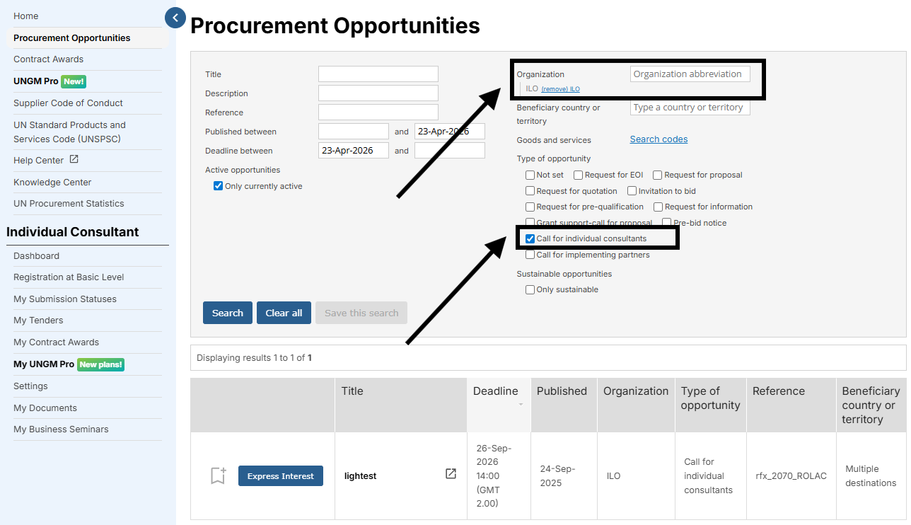 To find ILO procurement opportunities published specifically for Individual Consultants, use the filters available in the Procurement Opportunities public search: