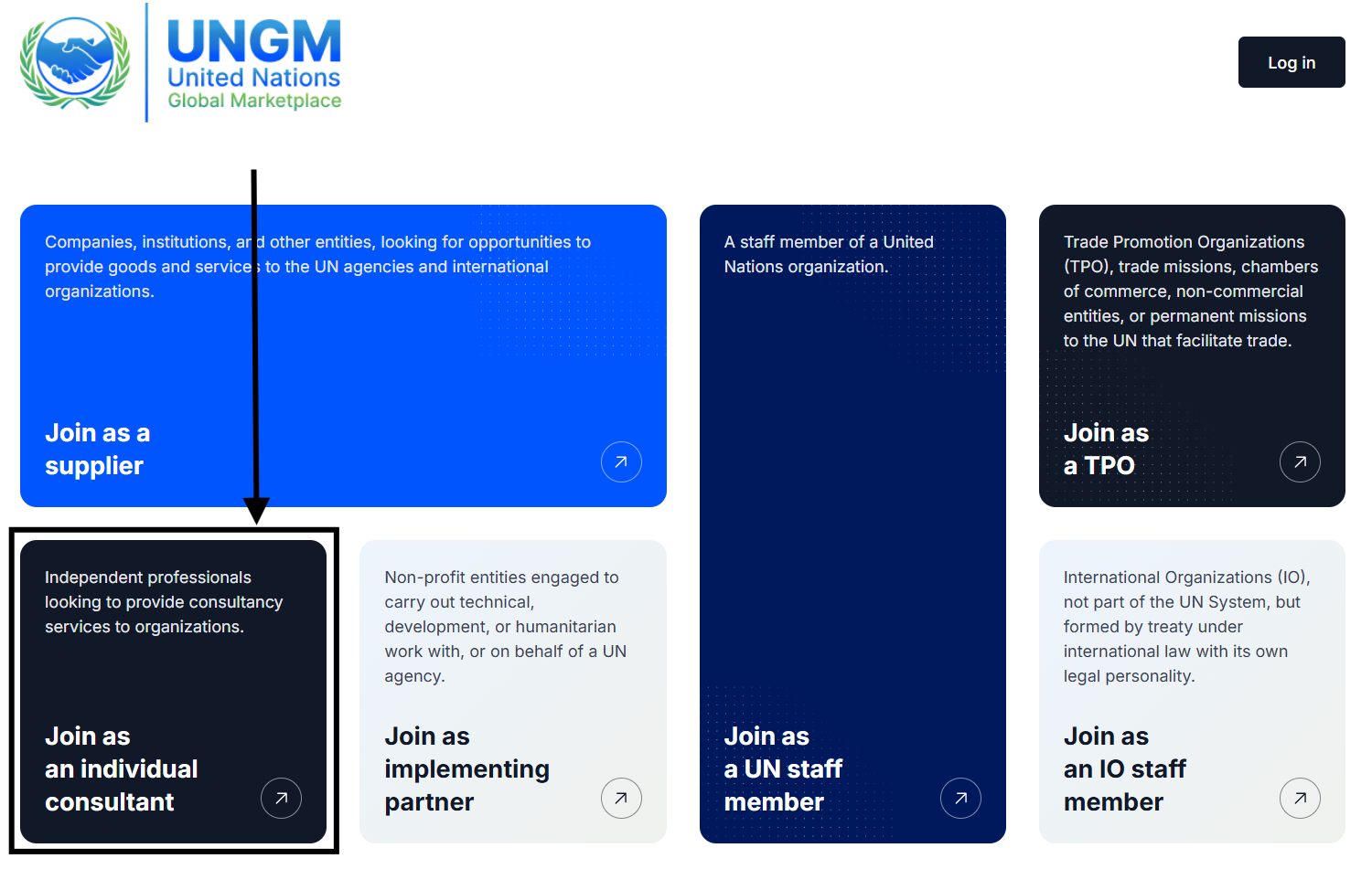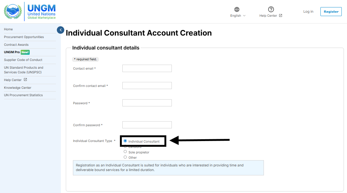 1. When creating an account, specifically select the Join as individual consultant tile. For more information, read the: How to create an individual consultant account on UNGM? article.