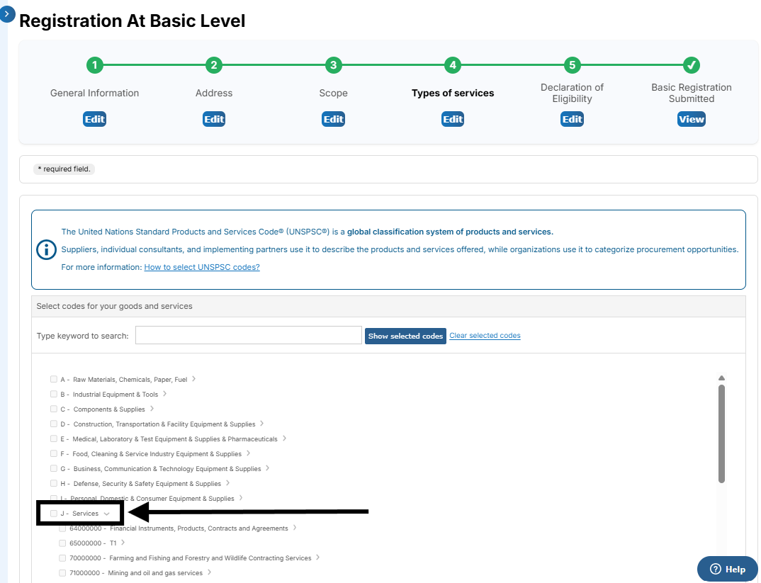 - In Step 4, Types of Services, select only the codes listed under J - Services, and do not select codes for physical goods or equipment, as they do not apply to Individual Consultant profiles registered with ILO.