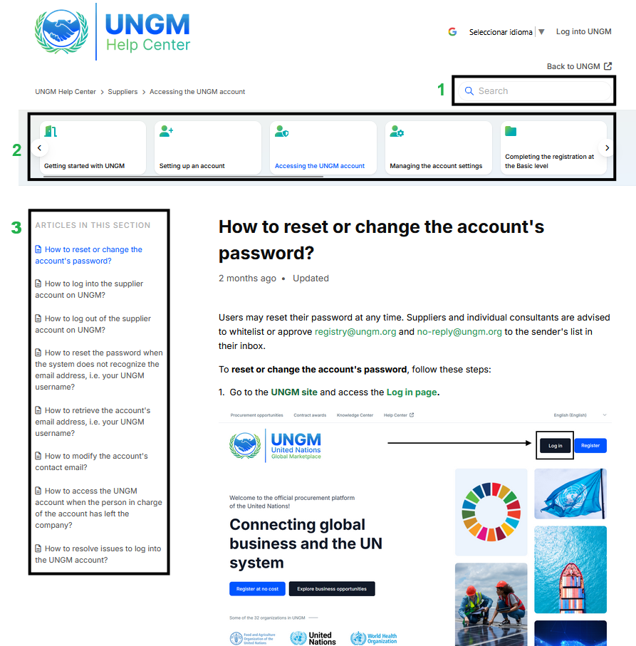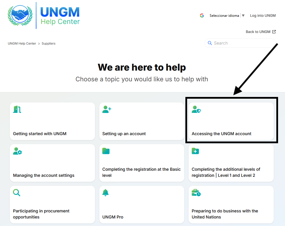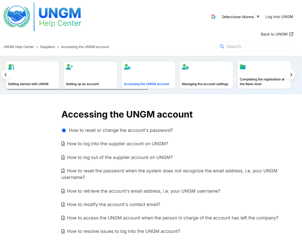 The UNGM Help Center is a self-service portal where users can find answers to their issues by referring to a fully-fledged and searchable knowledge base. There are currently +400 articles available to different users (Suppliers, Individual Consultants, Implementing Partners, UN and IO staff members, and Trade Promotion Organizations).